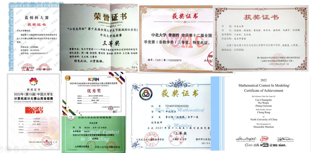 在学科竞赛中,获得2022年国际大学生数学建模竞赛二等奖、2022年全国大学生光电设计竞赛华北赛区三等奖、2022年互联网加竞赛校赛二等奖、2022年全国大学生计算机设计竞赛三等奖、2022年蓝桥杯单片机组省级三等奖、2022年大学生节能减排竞赛校赛三等奖;2021年获得五一杯全国大学生数学建模竞赛三等奖、ICAN全国大学生创新创业大赛优胜奖、高教社杯全国大学生数学建模竞赛优秀奖;2020年全国大学生数学竞赛三等奖;共计获得国际级奖项1项,省级奖项5项,校级奖项若干。
