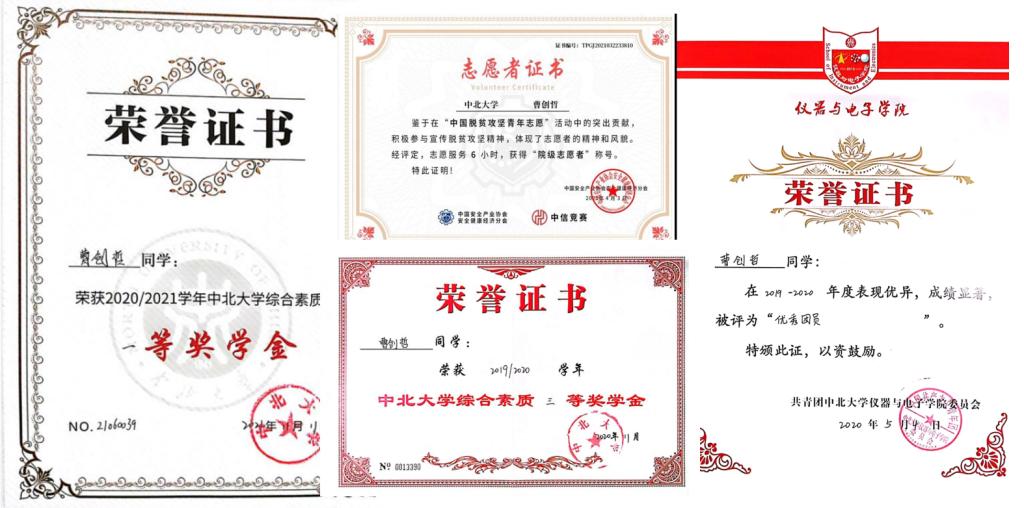 校级、院级优秀团员,优秀志愿者等荣誉称号。