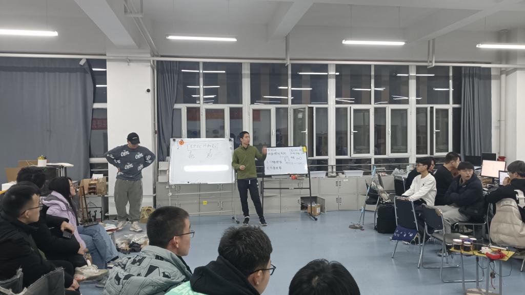 在新学期的第一个周末,机器人创新实验室主席邱俊浩召开了对21级实验室成员的例会。首先,邱俊浩对21级实验室成员的寒假学习内容进行针对性总结并提出本学期的基础学习目标及参赛要求。其次,邱俊浩对22级实验室成员的培训事项进行重新部署,并建议每位21级成员对2到3位22级成员负责其培训与参赛。最后,邱俊浩通知21级成员机器人创新实验室与仪器与测量实验室共同组建“EPOCH机器人”战排的事宜。机器人实验室主席邱俊浩首先介绍了机器人创新实验室和仪器与测量实验室重新布置场地,并向同学们强调了如此布置对两个实验室成员互相交流,互帮互助的重要性;之后,对战排性质及重要性进行明确和强调,激励成员进行组队参赛,钻研技术,为出校打比赛打下坚实的基础。
