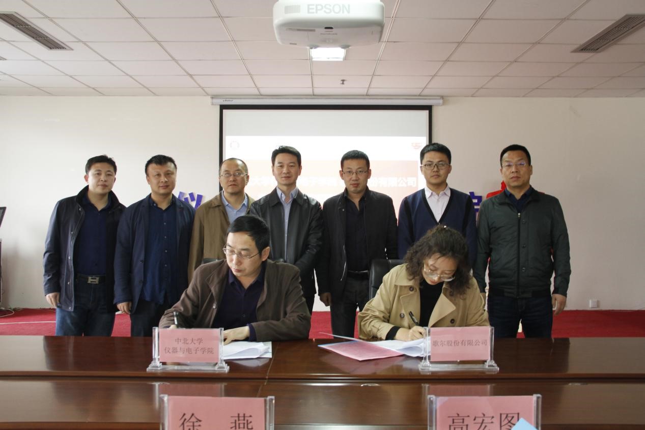 副院长刘文怡与歌尔股份有限公司徐燕部长共同签署合作协议,院党委副书记高宏图与徐燕部长共同揭牌。