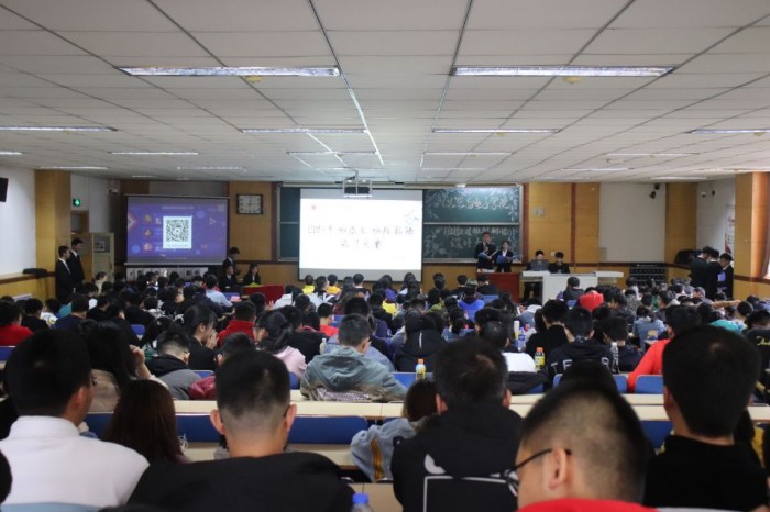 比赛开始前,学生科专职辅导员李晨鑫老师致开幕辞,表达了对活动圆满成功的祝愿。随后,每个班级都用各班的班徽图案以及班级标语诠释了自己班级的特色与风采。答辩过程中,各班以精心制作的ppt为辅助,使得寓意诠释更加明确,更加深入人心。同时,活动组织者书写了各班的班级标语,并在答辩环节将书法卷轴展示给现场观众,为整个活动增添了书香色彩。紧张激烈的答辩之余,现场还组织了轻松愉快的游戏环节和微信抽奖环节,让观众有了更多的参与感。