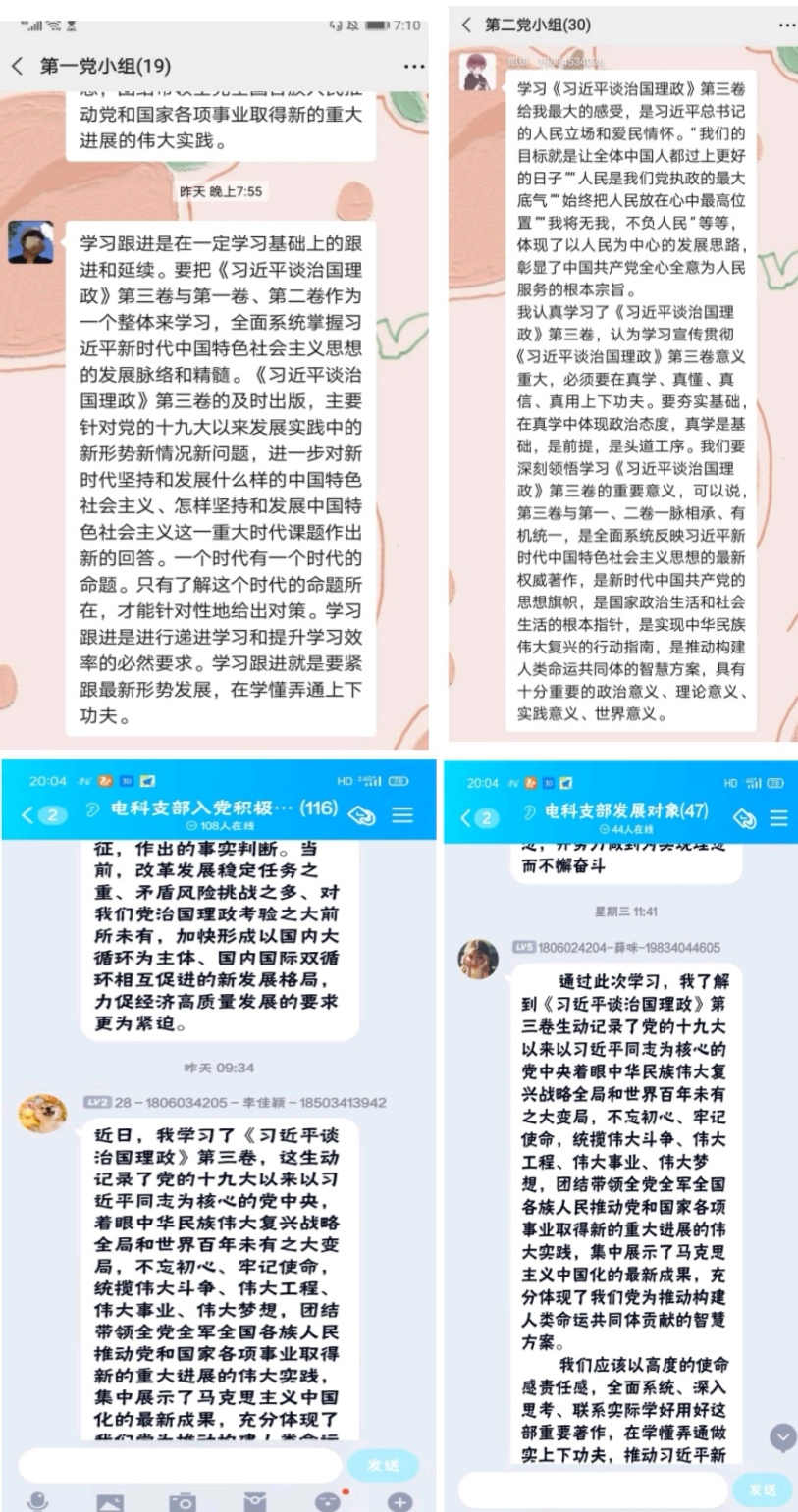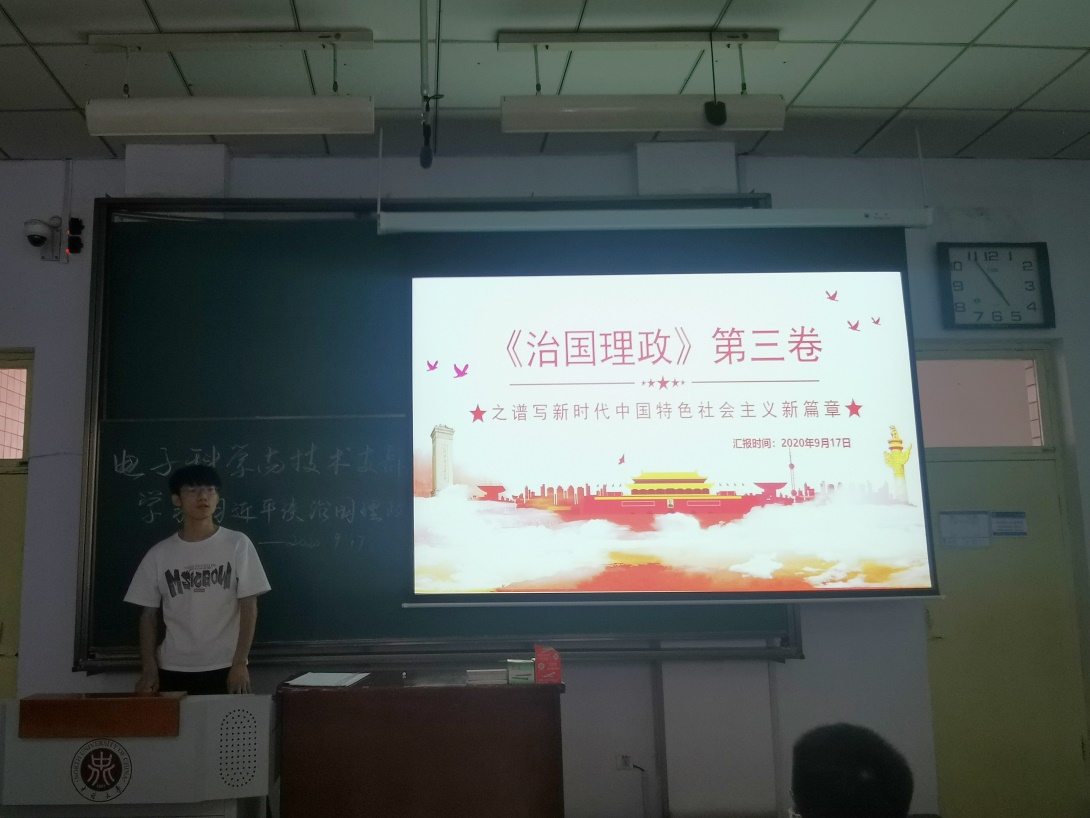 电子科学与技术党支部采取线上线下相结合的方式,开展了关于学习《习近平谈治国理政》第三卷的理论学习活动。通过此次活动,我支部各党小组及入党积极分子,发展对象深入了解了《习近平谈治国理政》第三卷的主要内容,感悟深刻。