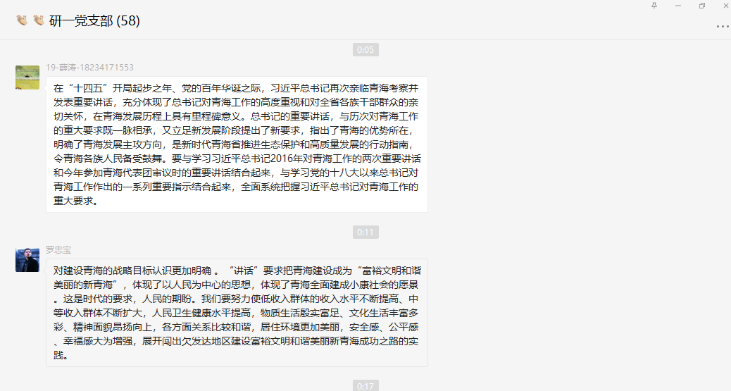 2021年6月19日晚上,研究生第一党支部根据上级精神,在线上认真学习贯彻《习近平总书记在青海考察期间重要讲话精神》。