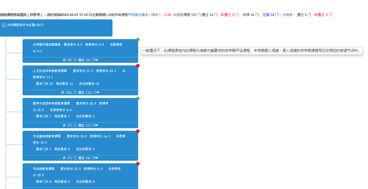 教学科本着符合OBE成果导向理念,以学生为本,再次与各系主任针对四个年级、五个专业的教学执行计划进行了更精细化的梳理与节点归类工作,并严格核对每一条课程数据基础信息,做到课程名称、课程编号、学分、学时、学年学期等每项信息内容都严格与培养方案统一,各学分节点的毕业要求进行了预设定,并对各学分节点进行了简要说明,让学生简明、直观、清晰的查阅及了解自己的学业情况。