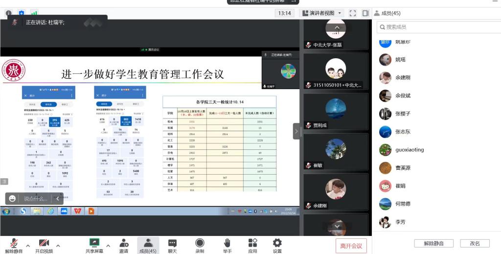 11月6日,副书记杜瑞平召开全体辅导员、班主任疫情防控工作再部署工作会议。她重点传达了学校近期疫情防控安全稳定专项工作会议的会议精神,要求全体辅导员、班主任要提高政治站位,充分认识当前疫情防控形势,把疫情防控工作放在第一位,压紧压实主体责任,切勿麻痹大意;同时要增强疫情防控敏感性和敏锐性,创新开展学生疫情防控活动,科学应对突发情况,严格请假审批。她还通报了近期因违反学校疫情防控管理规定出现的的违规违纪事件,并对学生行为规范、心理疏导、应急处置、公寓宿舍网格化管理等事项等进行了详细的安排。