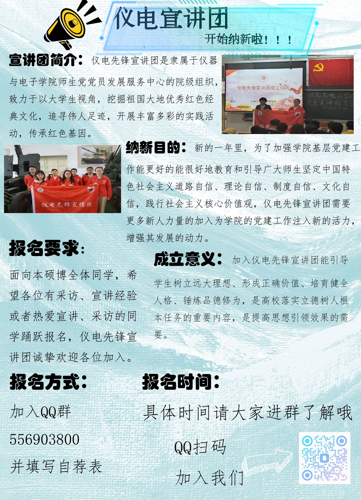 新的一年里,为了加强大奶妹做爱基层党建工作,能更好的能很好地教育和引导广大师生坚定中国特色社会主义道路自信、理论自信、制度自信、文化自信,践行社会主义核心价值观,仪电先锋宣讲团需要更多新人力量的加入为大奶妹做爱的党建工作注入新的活力,增强其发展的动力。