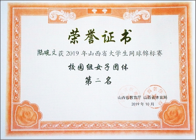 2019年陆晓文同学获山西省大学生网球锦标赛校园组女子团体第二名