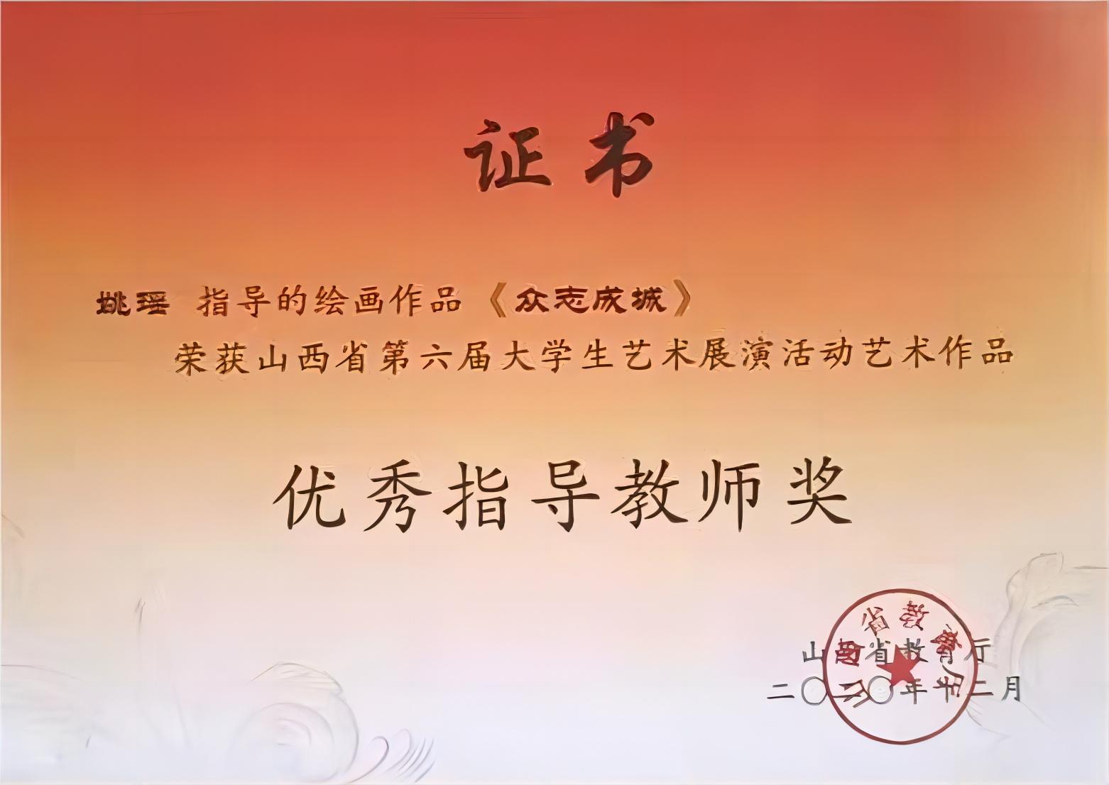 姚瑶2020年12月荣获山西省第六届大学生艺术展演活动艺术作品优秀指导教师奖