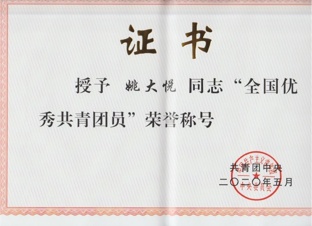 2020年姚大悦同学获得“全国优秀共青团员”荣誉称号