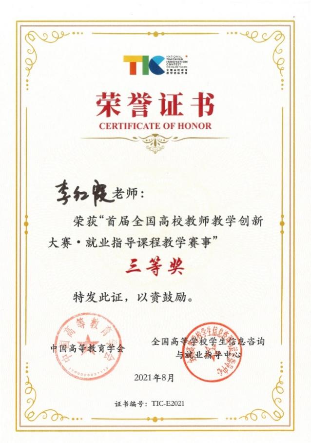 李红霞2021年8月1日荣获首届全国高校教师教学创新大赛•就业指导课程教学国赛三等奖