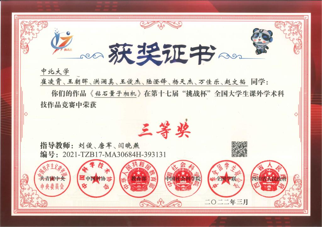 “挑战杯”国家级三等奖:崔凌霄、王朝晖登9位同学的作品《钻石量子相机》在第十七届“挑战杯”全国大学生课外学术科技作品竞赛中获三等奖