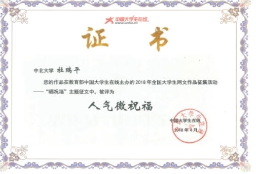 杜瑞平2018年4月在教育部中国大学生在线主办的2018年全国大学生网文作品征集活动中北评为“人气微祝福”