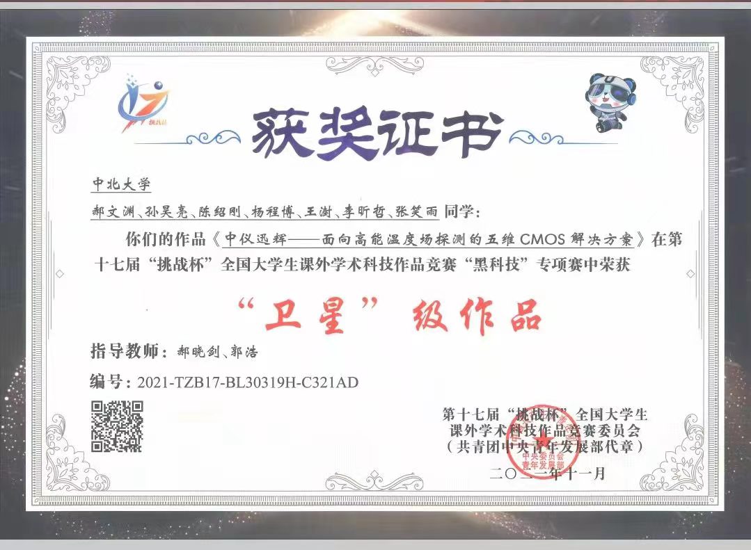 “挑战杯”黑科技专向赛荣获“卫星”级作品:郝文渊、孙昊亮等作品《中仪迅辉——面向高能温度场探测的五维CMOS解决方案》在第十七届“挑战杯”全国大学生课外学术科技作品竞赛“黑科技”专向赛中荣获“卫星”级作品
