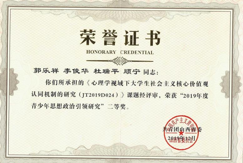 郭乐祥2019年12月荣获共青团山西省委2019年青少年思想政治引领研究二等奖