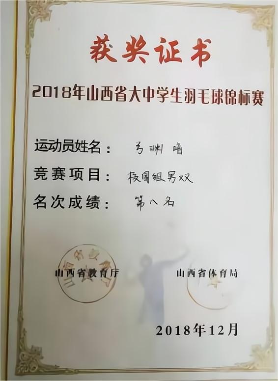 2018年弓渊培同学获山西省第五届山西证券智勇贺岁杯羽毛球混合团体赛校园组男双第八名