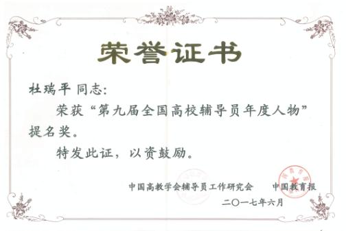 杜瑞平2017年6月荣获“第九届全国高校辅导员年度人物”提名奖